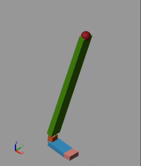 下の動画は、ペンギンの骨格に基づいたモデルを用いた運動学シミュレーションです。このシミュレーションでは、姿勢を維持した状態での床の姿勢角の変更に伴う足先の位置を決定しています。