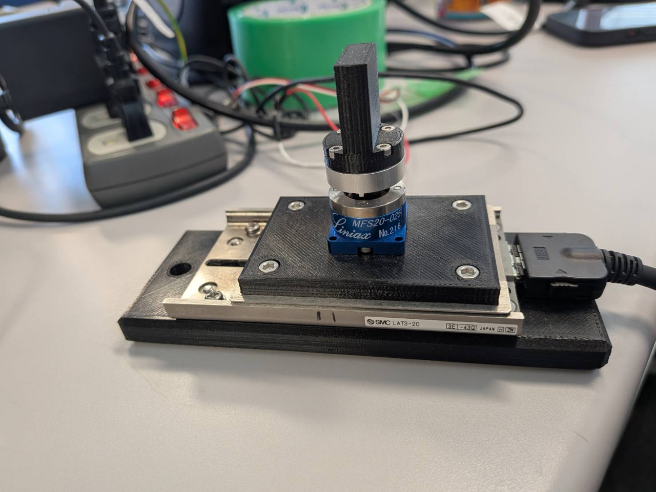 下段のアクチュエータに連動して上段のアクチュエータがスライドし、環境に接触した力感覚が下段にも伝わるようになっています。