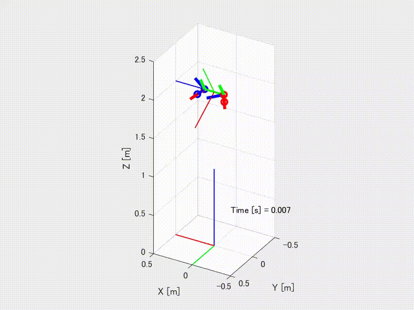 下の動画は、コンピュータを使ったシミュレーションです。このシミュレーションでは、ロボットの胴体の向きをコントロールしています。